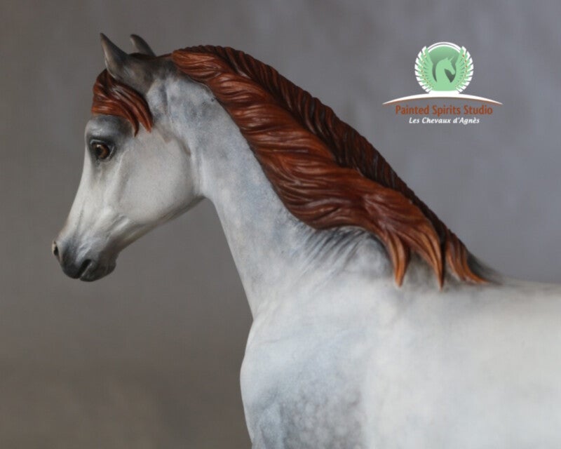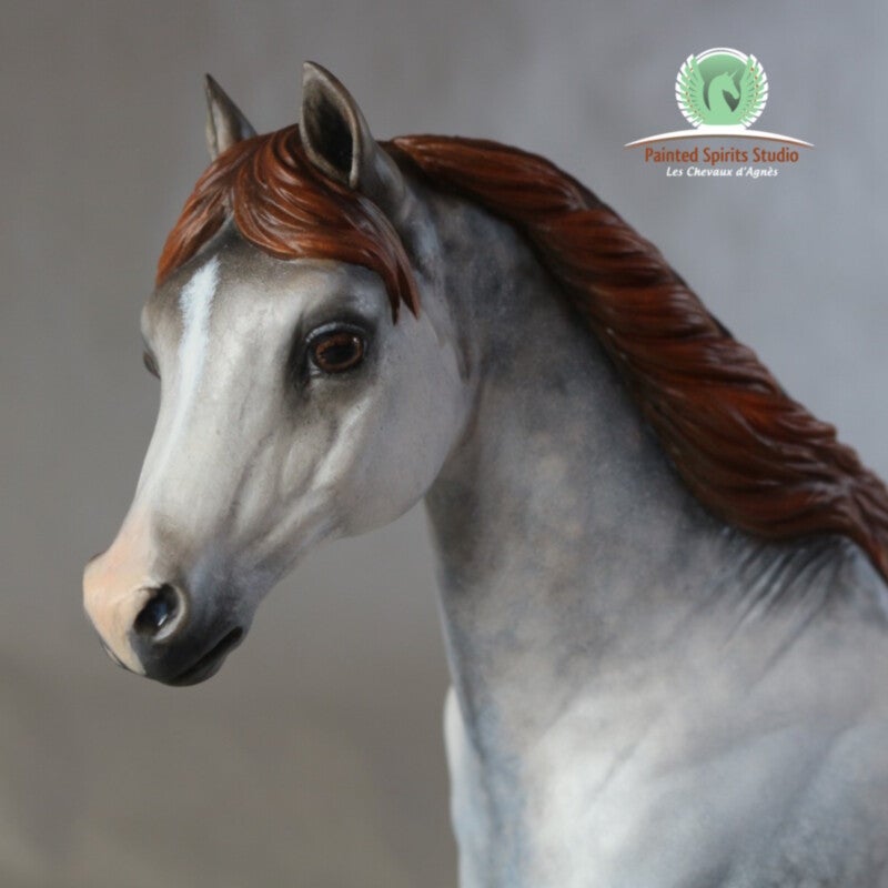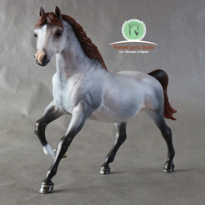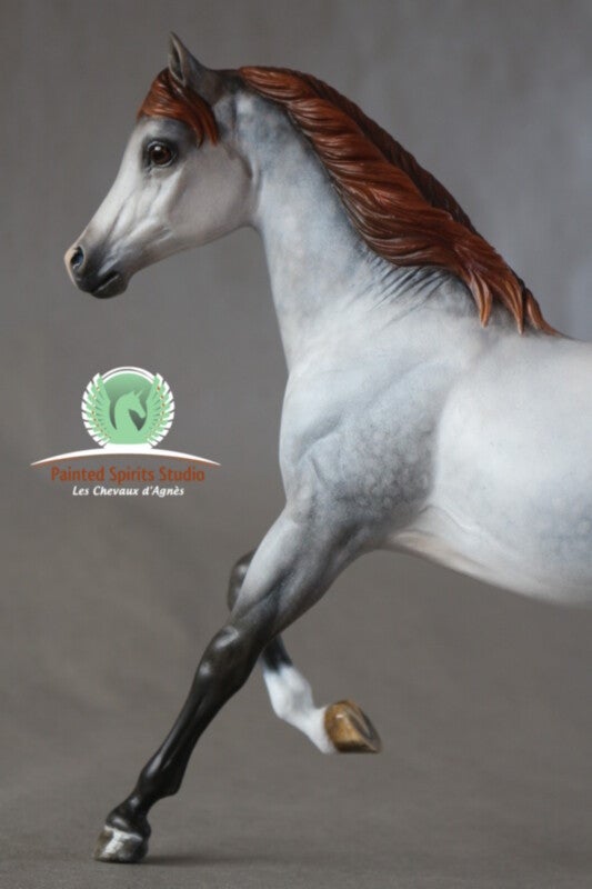 Peint à la main aux pastels secs et acryliques. La figurine est protégée par un vernis satiné. Les yeux, naseaux et sabots sont brillants. Le logo Breyer a été supprimé.