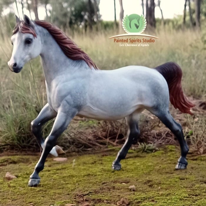 The remarkable transformations are by Valentine (Studio Valran). The mane, forelock, and tail reveal the beauty of the model, despite its age, dating back to the 1960s. In addition, the ears have been sculpted and refined, the right front hoof features a sculpted sole, and the left hind hoof has been repositioned for improved stability and graceful movement.