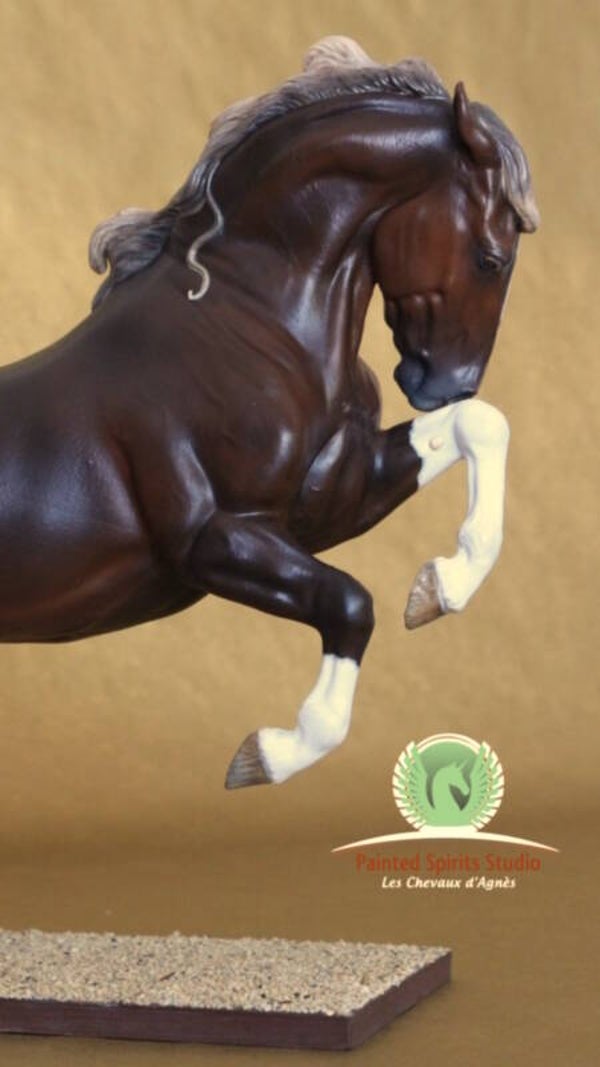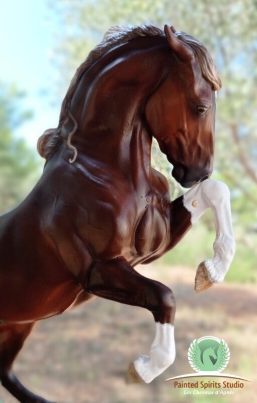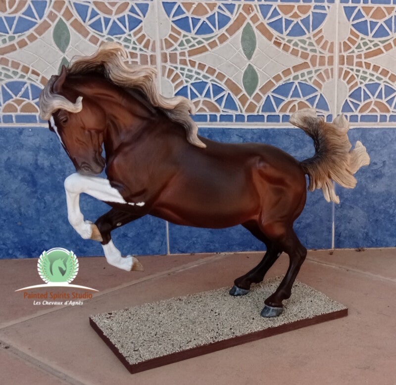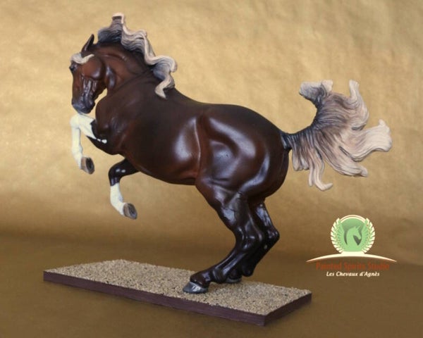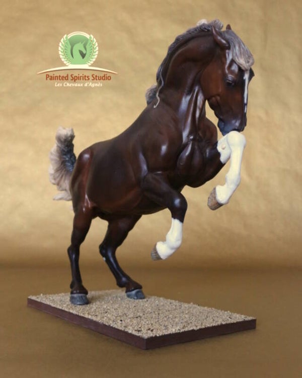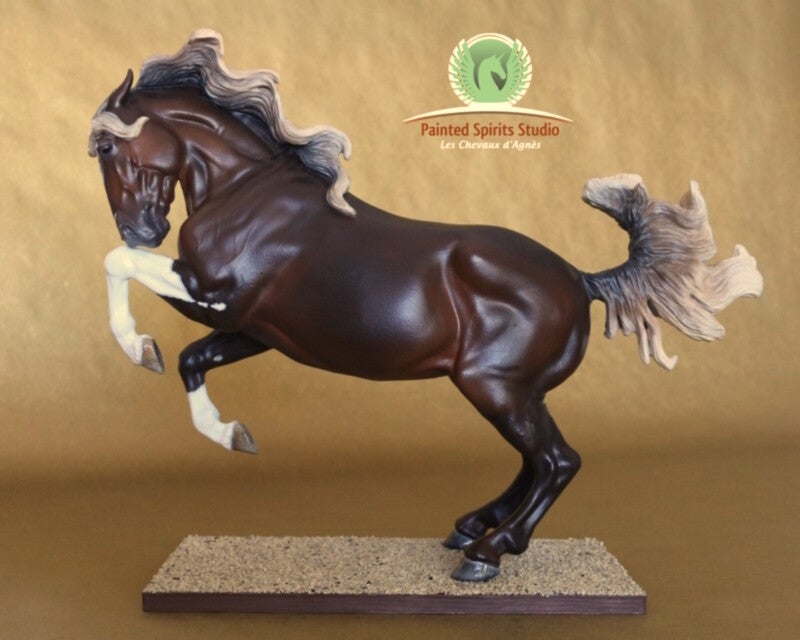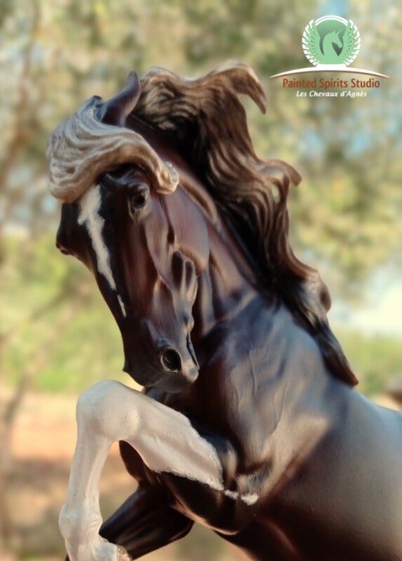Peint à la main aux pastels secs et acryliques. La figurine est protégée par un vernis satiné. Les yeux, naseaux et sabots sont brillants.