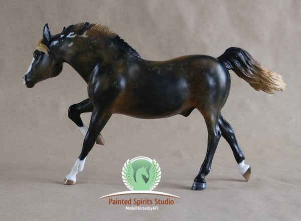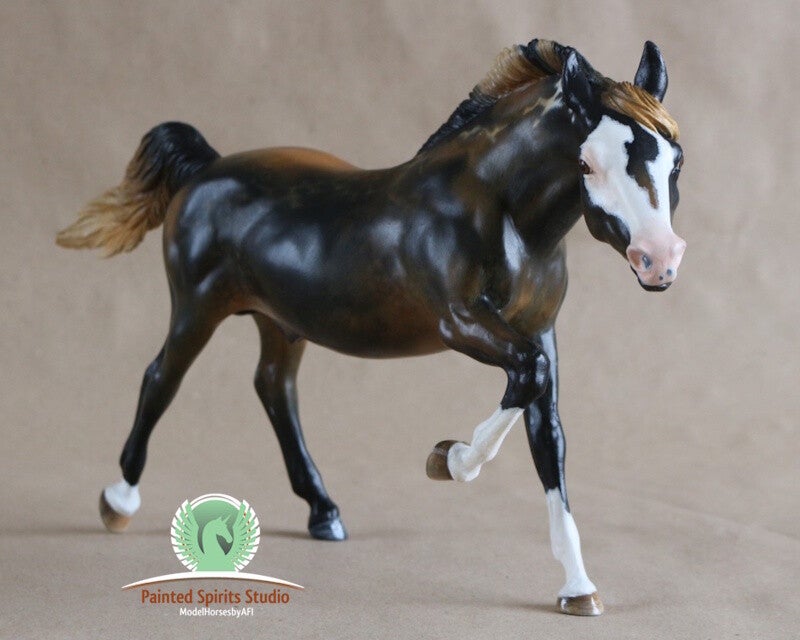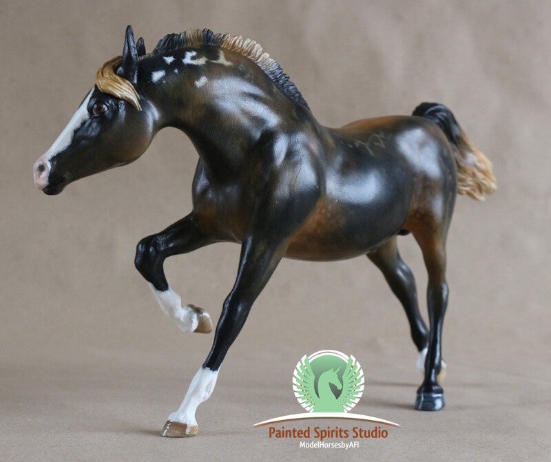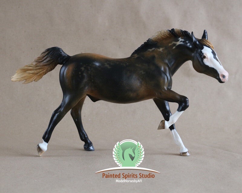 Hand-painted with dry pastels and acrylics. The figurine is protected with a satin varnish. The eyes, nostrils, and hooves are glossy. The Breyer logo has been removed.